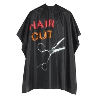 Schwarzer Haarschneide-Umhang aus Nylon, mit einem elastischen Kragen und Hakenverschluss. Wasserdicht und antistatisch. Größe: 125 x 145 cm.